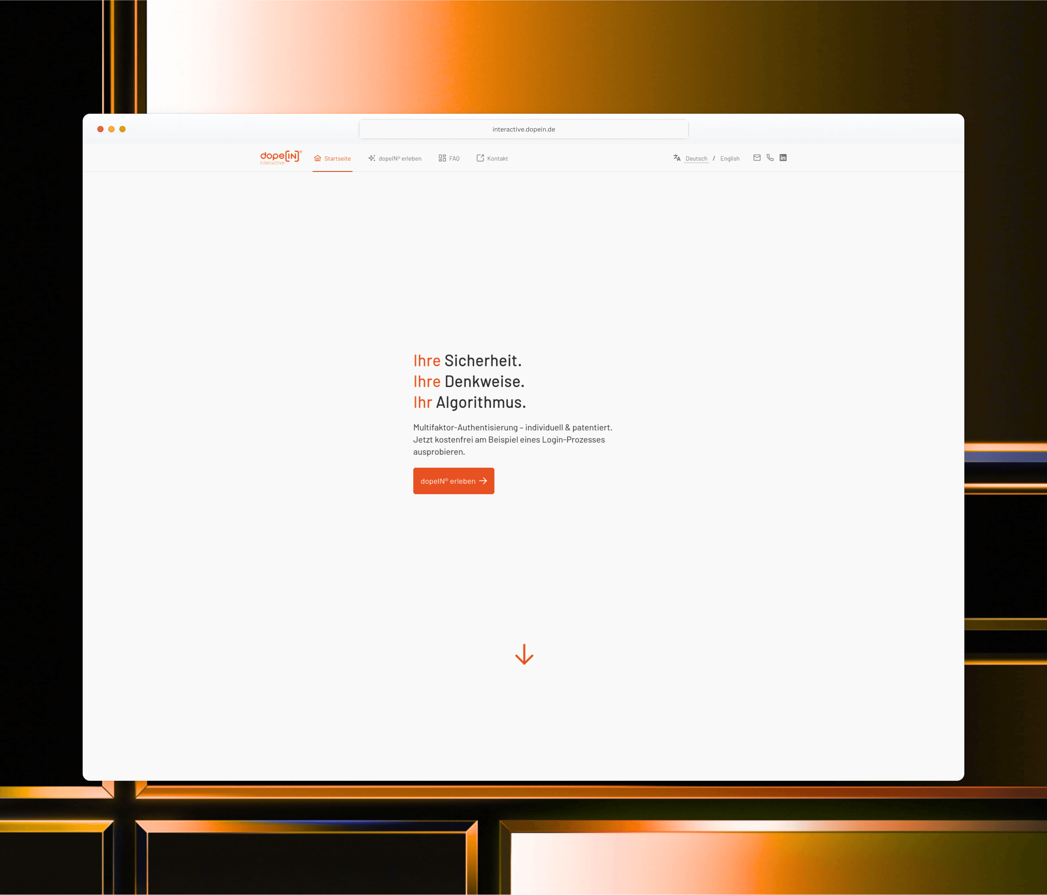 Gemeinsam mit der dopeIN® Patentverwertung GmbH haben wir ein funktionales MVP entwickelt, welches das patentierte Verfahren nicht nur visuell und inhaltlich greifbar macht, sondern die innovative Multifaktor-Authentisierung auch aktiv durchführbar werden lässt – online, direkt im Browser.